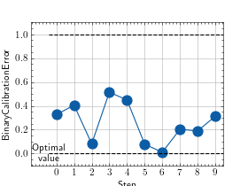 >>> from torch import rand, randint >>> # Example plotting multiple values >>> from torchmetrics.classification import BinaryCalibrationError >>> metric = BinaryCalibrationError(n_bins=2, norm='l1') >>> values = [ ] >>> for _ in range(10): ... values.append(metric(rand(10), randint(2,(10,)))) >>> fig_, ax_ = metric.plot(values)