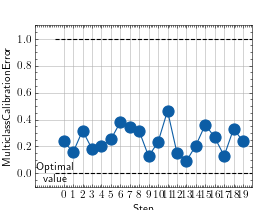 >>> from torch import randn, randint >>> # Example plotting a multiple values >>> from torchmetrics.classification import MulticlassCalibrationError >>> metric = MulticlassCalibrationError(num_classes=3, n_bins=3, norm='l1') >>> values = [] >>> for _ in range(20): ... values.append(metric(randn(20,3).softmax(dim=-1), randint(3, (20,)))) >>> fig_, ax_ = metric.plot(values)