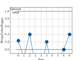 >>> from torch import rand, randint >>> # Example plotting multiple values >>> from torchmetrics.classification import BinaryCohenKappa >>> metric = BinaryCohenKappa() >>> values = [ ] >>> for _ in range(10): ... values.append(metric(rand(10), randint(2,(10,)))) >>> fig_, ax_ = metric.plot(values)