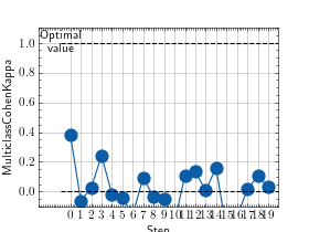 >>> from torch import randn, randint >>> # Example plotting a multiple values >>> from torchmetrics.classification import MulticlassCohenKappa >>> metric = MulticlassCohenKappa(num_classes=3) >>> values = [] >>> for _ in range(20): ... values.append(metric(randn(20,3).softmax(dim=-1), randint(3, (20,)))) >>> fig_, ax_ = metric.plot(values)