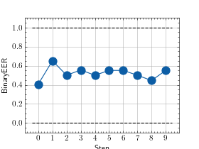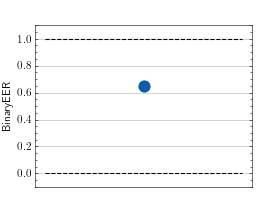 \[\text{EER} = \frac{\text{FAR} + (1 - \text{FRR})}{2}, \text{where} \min_t abs(FAR_t-FRR_t)\]The Equal Error Rate (EER) is the point where the False Positive Rate (FPR) and True Positive Rate (TPR) are equal, or in practise minimized. A lower EER value signifies higher system accuracy.