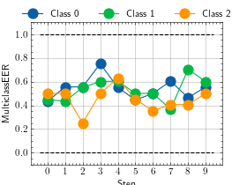 >>> # Example plotting multiple values >>> import torch >>> from torchmetrics.classification import MulticlassEER >>> metric = MulticlassEER(num_classes=3) >>> values = [ ] >>> for _ in range(10): ... values.append(metric(torch.randn(20, 3), torch.randint(3, (20,)))) >>> fig_, ax_ = metric.plot(values)