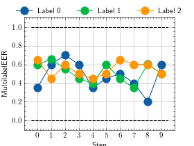 >>> # Example plotting multiple values >>> import torch >>> from torchmetrics.classification import MultilabelEER >>> metric = MultilabelEER(num_labels=3) >>> values = [ ] >>> for _ in range(10): ... values.append(metric(torch.rand(20,3), torch.randint(2, (20,3)))) >>> fig_, ax_ = metric.plot(values)