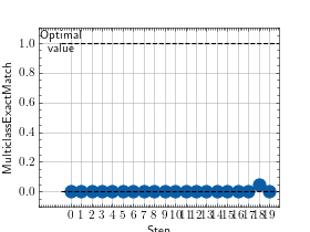 >>> # Example plotting multiple values >>> from torch import rand, randint >>> from torchmetrics.classification import MultilabelExactMatch >>> metric = MultilabelExactMatch(num_labels=3) >>> values = [ ] >>> for _ in range(10): ... values.append(metric(randint(2, (20, 3, 5)), randint(2, (20, 3, 5)))) >>> fig_, ax_ = metric.plot(values)