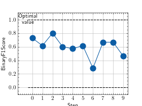 >>> from torch import rand, randint >>> # Example plotting multiple values >>> from torchmetrics.classification import BinaryF1Score >>> metric = BinaryF1Score() >>> values = [ ] >>> for _ in range(10): ... values.append(metric(rand(10), randint(2,(10,)))) >>> fig_, ax_ = metric.plot(values)