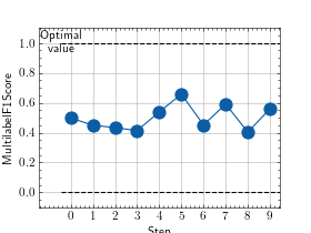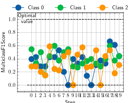 >>> from torch import rand, randint >>> # Example plotting multiple values >>> from torchmetrics.classification import MultilabelF1Score >>> metric = MultilabelF1Score(num_labels=3) >>> values = [ ] >>> for _ in range(10): ... values.append(metric(randint(2, (20, 3)), randint(2, (20, 3)))) >>> fig_, ax_ = metric.plot(values)