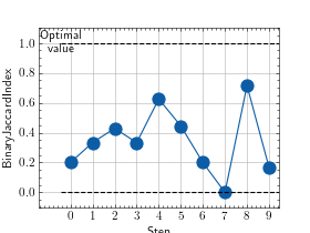 >>> # Example plotting multiple values >>> from torch import rand, randint >>> from torchmetrics.classification import BinaryJaccardIndex >>> metric = BinaryJaccardIndex() >>> values = [ ] >>> for _ in range(10): ... values.append(metric(rand(10), randint(2,(10,)))) >>> fig_, ax_ = metric.plot(values)