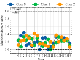 >>> # Example plotting a multiple values per class >>> from torch import randint >>> from torchmetrics.classification import MulticlassJaccardIndex >>> metric = MulticlassJaccardIndex(num_classes=3, average=None) >>> values = [] >>> for _ in range(20): ... values.append(metric(randint(3, (20,)), randint(3, (20,)))) >>> fig_, ax_ = metric.plot(values)