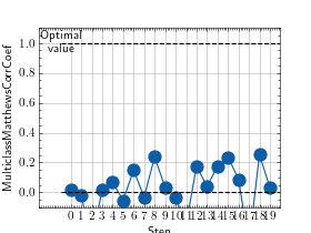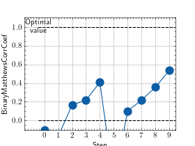 >>> from torch import rand, randint >>> # Example plotting multiple values >>> from torchmetrics.classification import BinaryMatthewsCorrCoef >>> metric = BinaryMatthewsCorrCoef() >>> values = [ ] >>> for _ in range(10): ... values.append(metric(rand(10), randint(2,(10,)))) >>> fig_, ax_ = metric.plot(values)