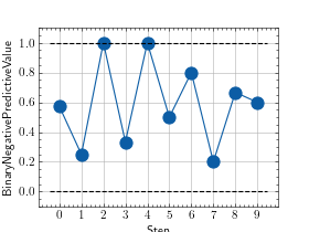 >>> from torch import rand, randint >>> # Example plotting multiple values >>> from torchmetrics.classification import BinaryNegativePredictiveValue >>> metric = BinaryNegativePredictiveValue() >>> values = [ ] >>> for _ in range(10): ... values.append(metric(rand(10), randint(2,(10,)))) >>> fig_, ax_ = metric.plot(values)