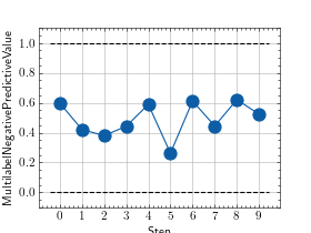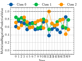 >>> from torch import rand, randint >>> # Example plotting multiple values >>> from torchmetrics.classification import MultilabelNegativePredictiveValue >>> metric = MultilabelNegativePredictiveValue(num_labels=3) >>> values = [ ] >>> for _ in range(10): ... values.append(metric(randint(2, (20, 3)), randint(2, (20, 3)))) >>> fig_, ax_ = metric.plot(values)
