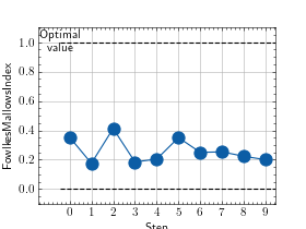 >>> # Example plotting multiple values >>> import torch >>> from torchmetrics.clustering import FowlkesMallowsIndex >>> metric = FowlkesMallowsIndex() >>> values = [ ] >>> for _ in range(10): ... values.append(metric(torch.randint(0, 4, (10,)), torch.randint(0, 4, (10,)))) >>> fig_, ax_ = metric.plot(values)