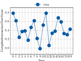 >>> # Example plotting multiple values >>> import torch >>> from torchmetrics.detection import CompleteIntersectionOverUnion >>> preds = [ ... { ... "boxes": torch.tensor([[296.55, 93.96, 314.97, 152.79], [298.55, 98.96, 314.97, 151.79]]), ... "scores": torch.tensor([0.236, 0.56]), ... "labels": torch.tensor([4, 5]), ... } ... ] >>> target = lambda : [ ... { ... "boxes": torch.tensor([[300.00, 100.00, 315.00, 150.00]]) + torch.randint(-10, 10, (1, 4)), ... "labels": torch.tensor([5]), ... } ... ] >>> metric = CompleteIntersectionOverUnion() >>> vals = [] >>> for _ in range(20): ... vals.append(metric(preds, target())) >>> fig_, ax_ = metric.plot(vals)